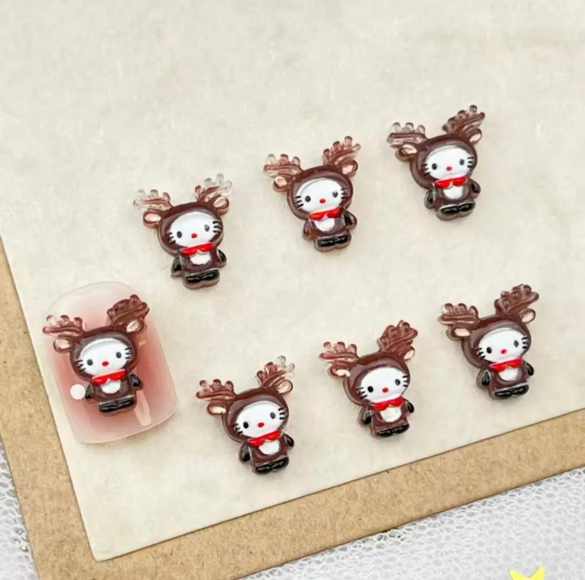Bring festive charm to your holiday manicure with these adorable Hello Kitty Christmas Nail Charms. This two-piece set features everyone's favorite character dressed in seasonal style, perfect for adding a playful touch to your nails. Whether you're celebrating the holidays or simply love Hello Kitty, these charms instantly elevate your nail art with character and personality. Easy to apply and instantly recognizable, they're the perfect way to spread holiday cheer through your fingertips. Make your nails merry and bright this season.